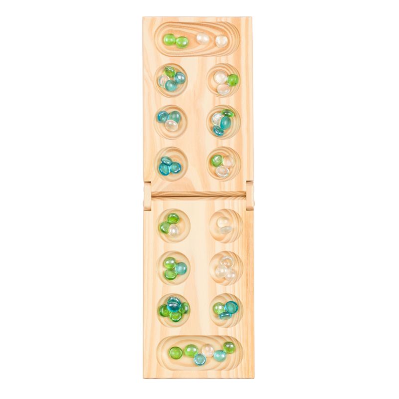 Foldable mancala board made of solid wood and high-quality glass gems in 3 colors. The Regal Games Mancala Board Game comes with everything you need to have a good time with family and friends, including a foldable wooden mancala board and 48 multicolored glass mancala stones, which is enough for 2 players.